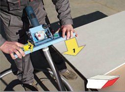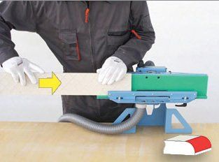 The Jolly Edge machine is designed for creating a perfect uniform miter or bullnose edge on tile material, even large format material. In a single pass you can easily perform a miter or bullnose cut on material from 5mm up to 20mm in thickness. The Jolly Edge can be adjusted to any angle between 40° and 50°. Add a diamond grinding wheel to perform a 6mm, 8mm, or 10mm bevel.
